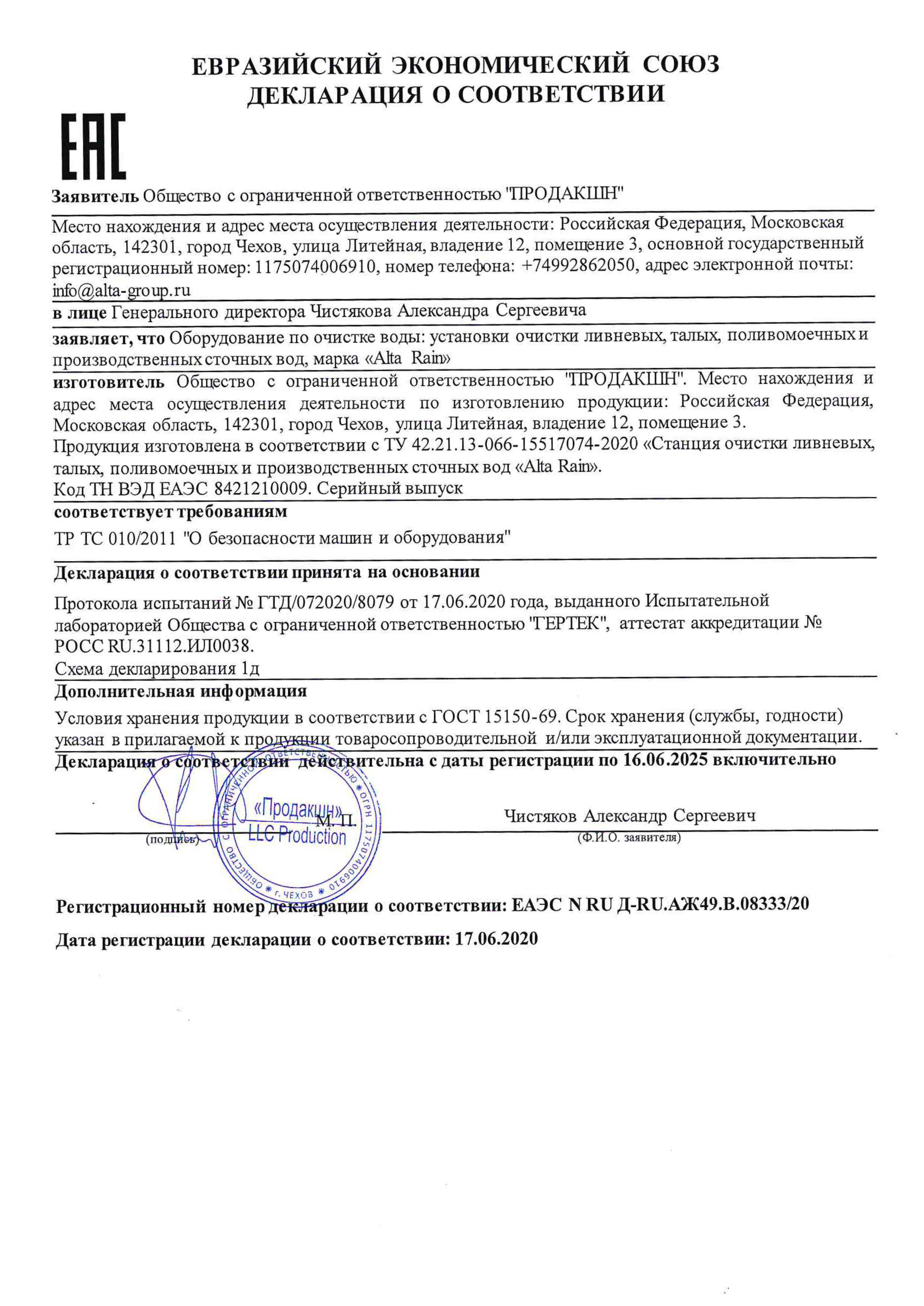 Комплекс поставляется в полной заводской готовности. Габариты блоков не превышают стандартные размеры, что позволяет транспортировать его типовым транспортом. Очистное сооружение ливневых стоков Alta Rain Pro 125 сертифицировано и снабжено всей необходимой документацией для монтажа, обслуживания и эксплуатации.